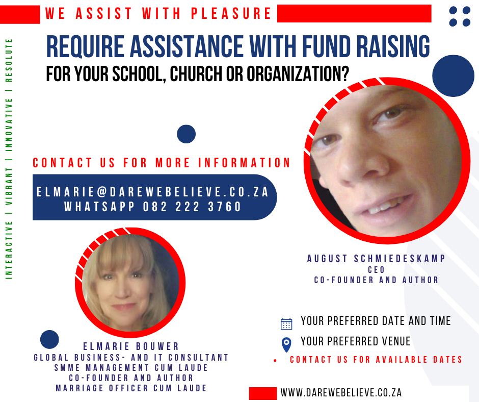 We aim to, God willing, give Presentations on the contents of the Book "Dare We Believe in a Life with a Purpose"; host Workshops on "Find Your Purpose", assist with Fundraisers for churches, schools, organizations, clubs, groups of interest, throughout South Africa. More information and contact detail below.